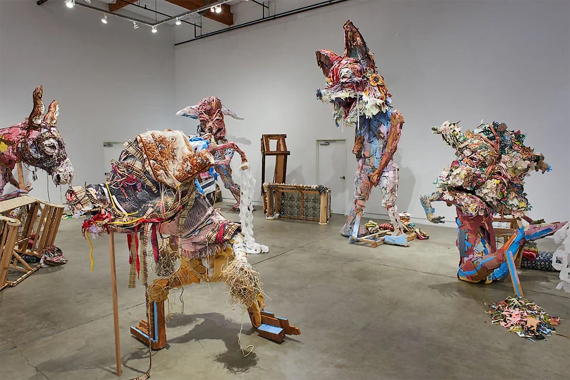 A teeming cast of figures — gas-masked wanderers, wide-eyed animals, and hybrid creatures — crowds a landscape that reads as equal parts bucolic countryside and fever dream. Higgins O'Connor layers graphite, ink, and washes of muted color across the sheet, building up a dense visual narrative where pastoral convention collides with the grotesque. Patches of soft pink and sickly yellow punctuate the predominantly gray-blue palette, drawing the eye through a composition that rewards prolonged looking. Untitled Pastoral channels the raw, compulsive energy of outsider art while demonstrating a sophisticated command of pictorial space and atmospheric depth.